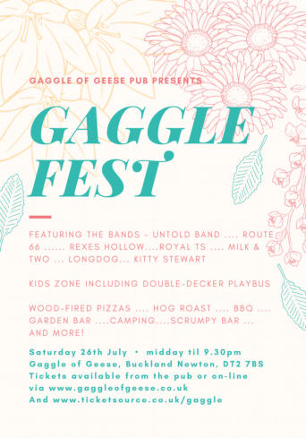 Knit & Natter -Thursday 12th&26thJune -the fortnightly crafting group. Free to attend. Bring a project and perhaps some cake! 2 til 4pm.Axe Throwing & Archery! -we have teamed upwith Dorset Medieval Archery tooffer axe throwing in the Gagglegardens most Saturdays 4pm to 7pm. Betaught the art of axe throwing and thenseeifyoucanwinaprizebysettingthehighestscoreoftheday!Noneedtobook,justpopalong andhaveagoforjust£6.BookablearcherysessionsintheGagglegardensacrosstheweekarenow also available through www.dorsetmedievalarchery.co.ukPizzaSaturdays!-ourpopularwood-firedpizzasareback!Cookinginthegardeninourwood-fired ovenwithourowndough.MostSaturdaysacrossthesummer.Bookingrecommended.Eatatthepub or takeaway.Open Mic Night -Wednesday 4thJune –pop down from 8pm to 10pm to enjoy local musicians. Or be brave and join in with a song or two.WillowWeaving-Wednesday18thJune-adaycourselearninghowtomakewillowbaskets (beginnerormoreadvanced).Lunch,tea&cakeincluded!Ticketsavailablevia www.ticketsource.co.uk/gaggleor by contacting the pub.Gagglefest–Saturday26thJuly–ourannualfamilyfriendlymusicfestival. Twostages,sevenbands, threebars,kids’zone,pizzas,BBQ,axethrowingcraftstallsandmore!Ticketsonsaleoverthebar and via www.ticketsource.co.uk/gaggleVillageFete-Monday25thAugust–theannualvillagefetehostedintheGagglegardens.Stalls, cakes,games,livemusic,dogshowandmore! Thefeteraisesmoneyforvillagegroups&causes. And weneedyourhelptorunstallsandhelpontheday.GetintouchorhaveachatwithSimonorSarah about how you can get involved.****************************************************************************************************